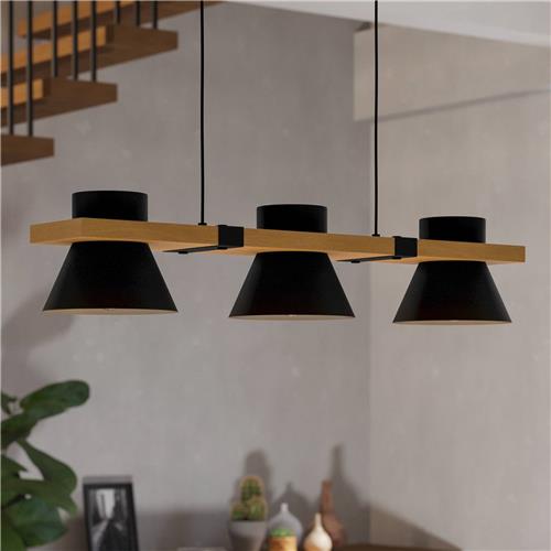 De EGLO Maccles hanglamp is een prachtige toevoeging aan je interieur. De lamp is gemaakt van hoogwaardig mat zwart gelakt staal en licht hout, wat zorgt voor een moderne en warme uitstraling. Met zijn drie metalen kappen in een plat, lang element van licht hout, creëert deze hanglamp een unieke sfeer in elke ruimte.