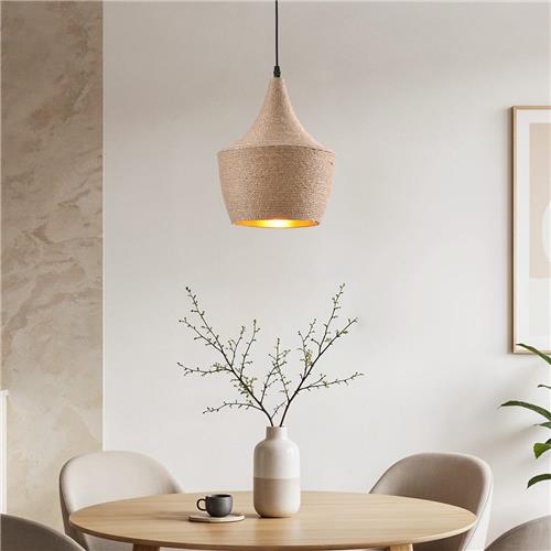 De landelijke hanglamp met touw Laos is een prachtige toevoeging aan elk interieur. Gemaakt van natuurlijke materialen straalt deze lamp een ontspannen en rustgevende sfeer uit. Het sterke touw dat om de kap is gewikkeld geeft de lamp een pure uitstraling, terwijl de gouden afwerking aan de binnenkant zorgt voor een warm en gezellig lichteffect.