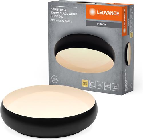 - Bij Bol.com kun je LEDVANCE ORBIS Livia LED plafondlamp met metalen ring, zwart en wit, 24W, 1500lm, 3000K, 430mm, 830 vriendelijk warm wit, dimbaar in 3 niveaus door te klikken, IP20, inclusief montageschroeven en pluggen kopen voor de prijs van € 64,95. Dit is vandaag de goedkoopste webshop.
