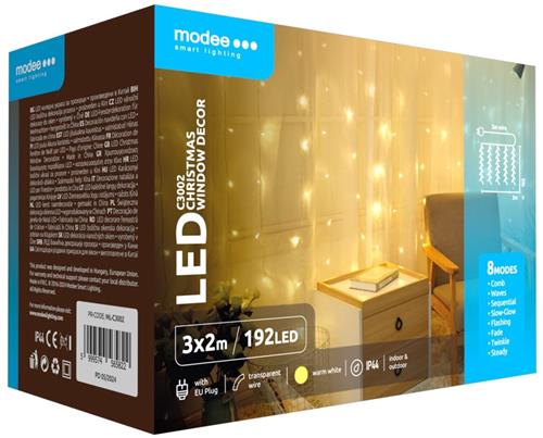 - Bij Bol.com kun je Modee Lichtgordijn 3x2 Meter - Kerstverlichting voor Buiten en Binnen - 192 LED Lampjes - 8 Lichtstanden - IP44 - 2700K - Warm Wit Licht - 3 stuks kopen voor de prijs van € 52,50. Dit is vandaag de goedkoopste webshop.