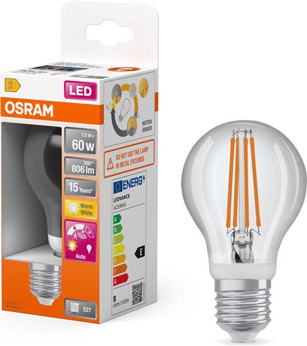 - Bij Bol.com kun je OSRAM LED Star Classic lamp met bewegingssensor en daglichtsensor, bolvorm, 7,3 W / 806 lm, EEK A, warm wit licht (2700 K), gemaakt van helder gekleurd loodvrij glas, E27 fitting, 60 mm diameter. kopen voor de prijs van € 15,99. Dit is vandaag de goedkoopste webshop.