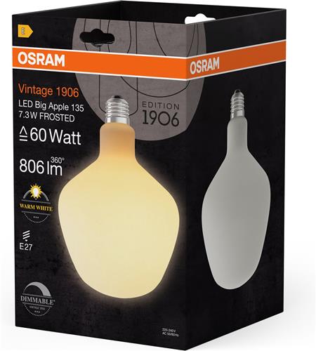 - Bij Lampen24 kun je OSRAM Vintage 1906 Big Apple, dimbare LED-lamp met appelvormige gloeidraad, biedt 7,3 W voor 806 lm, E27 fitting, mat glas, 135 mm diameter, kleurweergave CRI 80, 2700 K, EEK E. kopen voor de prijs van € 34,90. Dit is vandaag de goedkoopste webshop.
