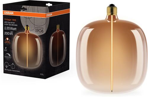 - Bij Lampen24 kun je OSRAM Vintage 1906 Big Oval, dimbare, decoratieve lamp met LED-filamentmagneettechnologie, biedt 4,8 W voor 200 lm, E27-fitting, theebruin ontwerp, 187 mm diameter, CRI 80. kopen voor de prijs van € 37,90. Dit is vandaag de goedkoopste webshop.