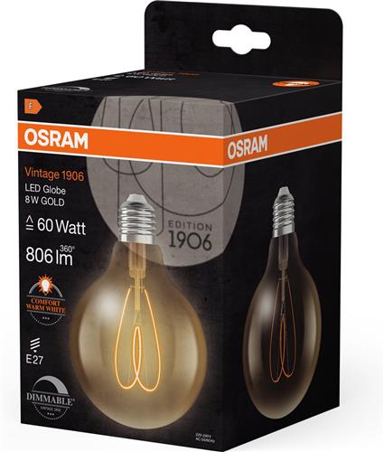 - Bij Lampen24 kun je OSRAM Vintage 1906 Globe, warmwitte, dimbare LED-lamp in klassieke bolvorm met gloeidraad, biedt 8 W voor 806 lm, E27 fitting, goudkleurig glas, 95 mm diameter, 2200 K, EEK F. kopen voor de prijs van € 7,90. Dit is vandaag de goedkoopste webshop.