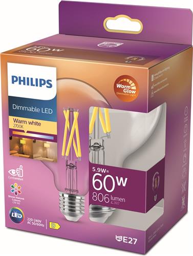 - Bij Bol.com kun je Philips LED Globe Transparant - 60 W - E27 - Dimbaar warmwit licht kopen voor de prijs van € 13,87. Dit is vandaag de goedkoopste webshop.