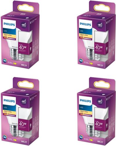 - Bij Bol.com kun je Philips Voordeelverpakking - E27 - LED Kogellamp - Mat - 40W - Niet Dimbaar - Warmwit Licht - Set van 4 Stuks kopen voor de prijs van € 11,98. Dit is vandaag de goedkoopste webshop.