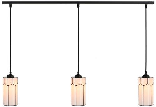 Sfeervolle Tiffany glaskap in sprankelende Franse Art Deco stijl. Het glamoureuze Tiffany model is gemaakt van gebogen paarlemoer glas. Imposant om naar te kijken! Chique, stijlvol en perfect. Totale lengte van de balk is 100 cm. Breedte 8 cm. Mogelijkheid voor montage van de 3 katoenpendels op 40-40 of 45-45 cm t.o.v. het midden. De katoensnoeren zijn standaard 150 cm en eenvoudig in te korten.