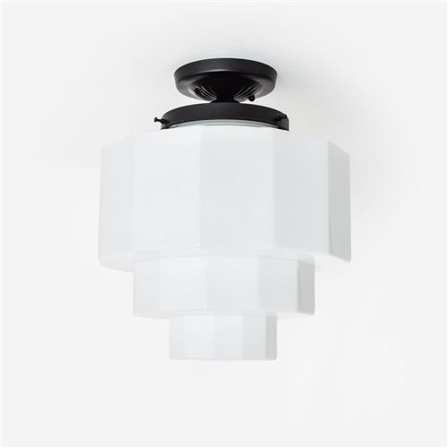 De Art Deco Trade - Plafonnière Dodecagon Moonlight is een spectaculaire glaskap met mondgeblazen design in meerdere etages en een twaalfhoekige vorm, wat het een echt Art Deco gevoel geeft. Het opaal witte glas contrasteert prachtig met het zwart gepatineerde armatuur, dat een vintage uitstraling toevoegt aan het geheel. Deze plafonnière is voorzien van 1x E-27 fitting en past perfect bij een breed scala aan interieurstijlen.