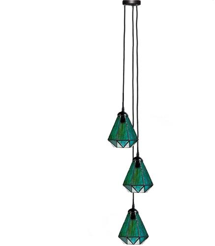 De Art Deco Trade Tiffany Kroonluchter Arata Green 3 is een schitterende toevoeging aan elk interieur. Met pittige lijnen en frisse transparante natuurkleuren is dit model een ware eyecatcher. Het geometrische patroon in helder en groen waterglas zorgt voor een spannende combinatie van stijlvol design. De glaskappen hangen op verschillende hoogten en de smaragdgroene kleuren in combinatie met mathematische lijnen creëren een speels effect.