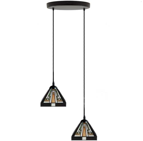 Deze pittoreske, strakke kroonluchter heeft een eigenwijs tintje met zijn twee piramidevormige kappen. Het geometrisch gepuzzeld glas in warme tinten bootst het effect van een waaier of een zon prachtig na. Perfect te combineren met de Tiffany lampen en het Frank Lloyd Wright paneel uit de Geometric serie, evenals met de Rising Sun Uplighter. De verschillende hoogten waarop de glaskappen hangen, gecombineerd met prettige kleuren en vloeiende lijnen, creëren een speels en stijlvol ontwerp dat perfect past in hallen, trappenhuizen, boven de salontafel en eettafel.