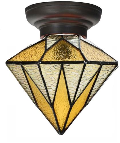 De Art Deco Trade - Tiffany Plafonnière Aiko Yellow is een schattig klein lampje met pittige lijnen in frisse transparante kleuren. Het geometrische patroon in helder en geel "waterglas" zorgt voor een briljant Tiffany plafondlampje dat een spannende combinatie vormt. Met een E-14 fitting en een afgerond armatuur kan dit lampje ook heel leuk zijn als wandlamp.