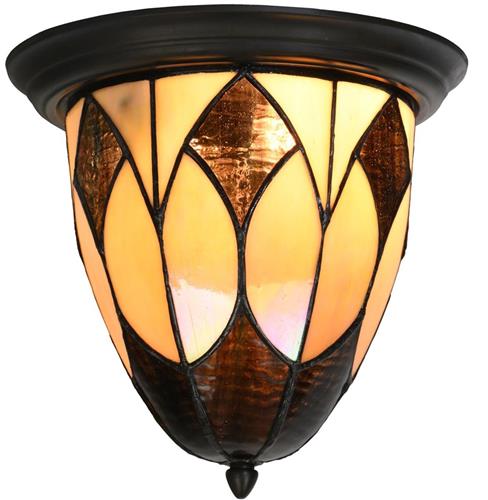 Een prachtige toevoeging aan je interieur, deze unieke Tiffany plafonnière geïnspireerd op de Amsterdamse School stijl. De paraboolvorm omlijst door een stoere rand zorgt voor een expressionistisch en decoratief element in elke ruimte. Met warme tinten parelmoer, crème en bruin, zal deze lamp zeker de aandacht trekken.