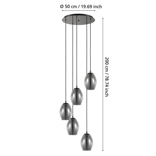 Met zijn ovaalvormige lampenkappen van rookglas in de kleuren zwart en grijs, zorgt de EGLO Estanys hanglamp voor een warme en gezellige verlichting. De lichtbronnen hebben een levensduur van 5 jaar en zijn eenvoudig te verwijderen. De lamp is CE gemarkeerd en voldoet aan alle kwaliteitseisen voor een veilig gebruik in huis.