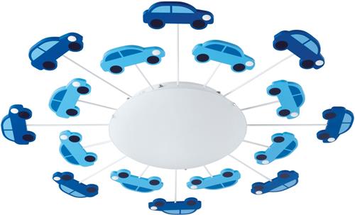 De EGLO Viki 1 plafond- en wandlamp is een absolute eyecatcher voor de kinderkamer met zijn unieke blauwe auto-thema ontwerp. Deze moderne lamp van hoogwaardig staal en satijnglas heeft een diameter van 63 cm en straalt klasse en kwaliteit uit in elke ruimte.