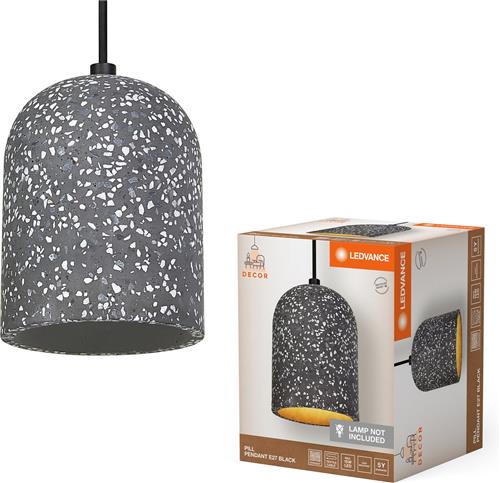 De LEDVANCE Decor Pill Pendant 1XE27 Black is een decoratief armatuur met een E27 lampvoet, ideaal voor binnentoepassingen zoals gangen, entrees, trappenhuizen, woonkamers en kelders. De behuizing van het armatuur is gemaakt van hoogwaardig metaal en terrazzo, wat zorgt voor een duurzame oplossing. Dankzij de kabel van textiel en de universele fitting is de keuze van de lichtbron zeer flexibel.