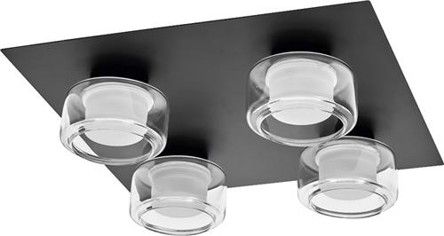 Dankzij de IP44 bescherming is deze lamp bestand tegen vreemde voorwerpen en spatwater, waardoor hij perfect is voor zowel binnen- als buitengebruik. De vierkante armatuur met aluminium plafondplaat en transparante glazen kappen geven een moderne uitstraling aan de lamp.