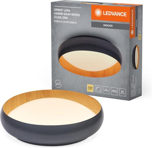 - De goedkoopste webshop om LEDVANCE ORBIS Livia LED plafondlamp met metalen ring, grijs/hout decor, 24W, 1200lm, 3000K, 430mm, 830 vriendelijk warm wit, dimbaar in 3 niveaus door te klikken, IP20, inclusief schroeven/pluggen te kopen is voor het laatst gecontroleerd op zaterdag 14 februari 2026.