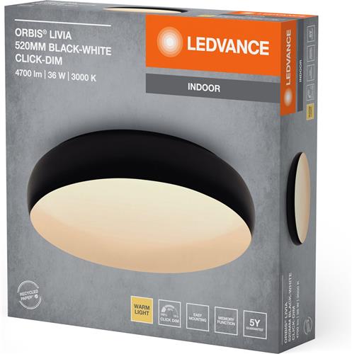 - Bij Bol.com kun je LEDVANCE ORBIS Livia LED plafondlamp met metalen ring, zwart en wit, 36W, 2400lm, 3000K, 520mm, 830 vriendelijk warm wit, dimbaar in 3 niveaus door te klikken, IP20, inclusief montageschroeven en pluggen kopen voor de prijs van € 84,95. Dit is vandaag de goedkoopste webshop.