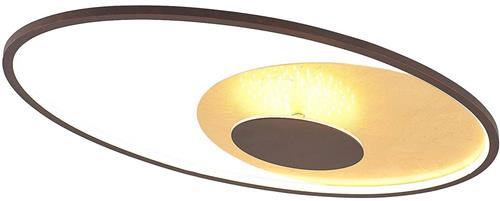 De Lindby LED plafondlamp Feival is een opvallende toevoeging aan een moderne woonkamer. Met zijn uniek ontwerp is deze lamp een echte eyecatcher. De lamp bestaat uit een ronde, gouden plafondplaat omringd door een roestkleurige ring in ovale vorm. De LED's binnenin de ring stralen aangenaam licht uit in de omgeving, terwijl de indirecte lichtbron achter het zwarte deksel zorgt voor een warme reflectie op het gouden oppervlak, waardoor een romantische sfeer ontstaat.