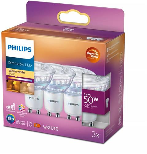 - Bij Bol.com kun je Philips energiezuinige LED Spot - 50 W - GU10 - Dimbaar warmwit licht - 3 stuks - Bespaar op energiekosten kopen voor de prijs van € 18,48. Dit is vandaag de goedkoopste webshop.