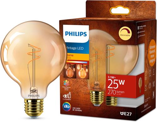 - Bij Bol.com kun je Philips LED Globe Spiraal Goud - 25 W - E27 - Dimbaar extra warmwit licht kopen voor de prijs van € 17,49. Dit is vandaag de goedkoopste webshop.