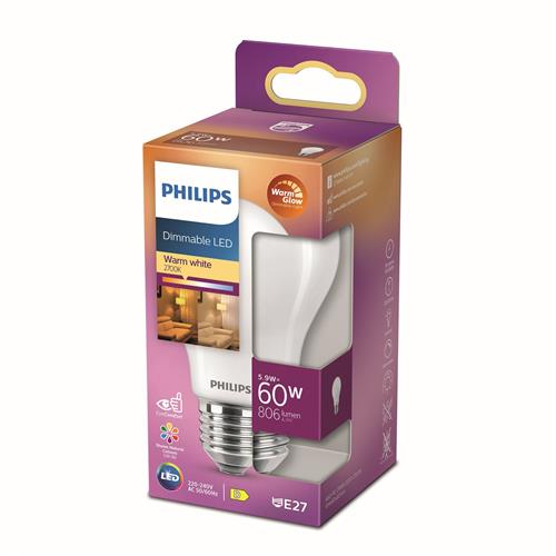 - Bij Lamponline kun je Philips LED Lamp Mat 60W E27 Dimbaar Warm Wit Licht kopen voor de prijs van € 12,95. Dit is vandaag de goedkoopste webshop.
