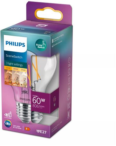 - Bij Bol.com kun je PHILIPS - LED Lamp - SceneSwitch Filament 827 A60 - E27 Fitting - Dimbaar - 1.6W-7.5W - Warm Wit 2200K-2700K | Vervangt 16W-60W kopen voor de prijs van € 8,99. Dit is vandaag de goedkoopste webshop.