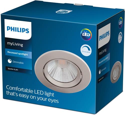 Met een lichtopbrengst van 350 lm per lichtpunt en een kleurtemperatuur van 2700 K zorgt de Philips Sparkle inbouwspot voor een warm en helder licht. Het is niet verstelbaar en wordt bediend met een wanddimmer of wandschakelaar voor eenvoudige aanpassing van de verlichting naar wens.