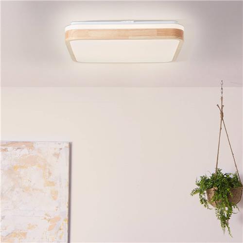 Dit is de Brilliant Leuchten LED-plafondlamp Tumeo, een stijlvolle toevoeging aan elk interieur. Met een afmeting van 40 x 40 cm en een vermogen van 24 W, zorgt deze lamp voor een heldere verlichting met 2400 lumen. Het design van metaal en hout in licht hout/wit past perfect bij een moderne inrichting.