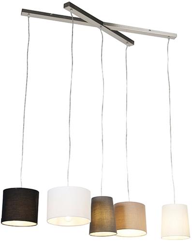 Deze landelijke hanglamp van QAZQA is gemaakt van textiel en heeft de kleur Staal, waardoor het perfect past in verschillende ruimtes zoals de woonkamer, slaapkamer en keuken. De lamp is voorzien van vijf lichtpunten en heeft een gewicht van 2.80 kg. De lamp is niet voorzien van een dimfunctie en wordt gevoed door netstroom.
