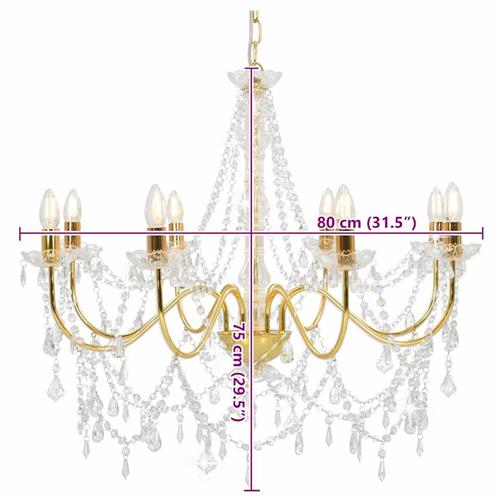 De kroonluchter heeft een gouden kleur voor de fittingen en transparante kralen. Met een afmeting van 80 x 75 cm (ø x H) en gemaakt van metaal (frame) en acryl (kralen), past deze verlichting perfect in ruimtes die een vleugje luxe en elegantie nodig hebben. Let op, de E14 peertjes worden niet meegeleverd.